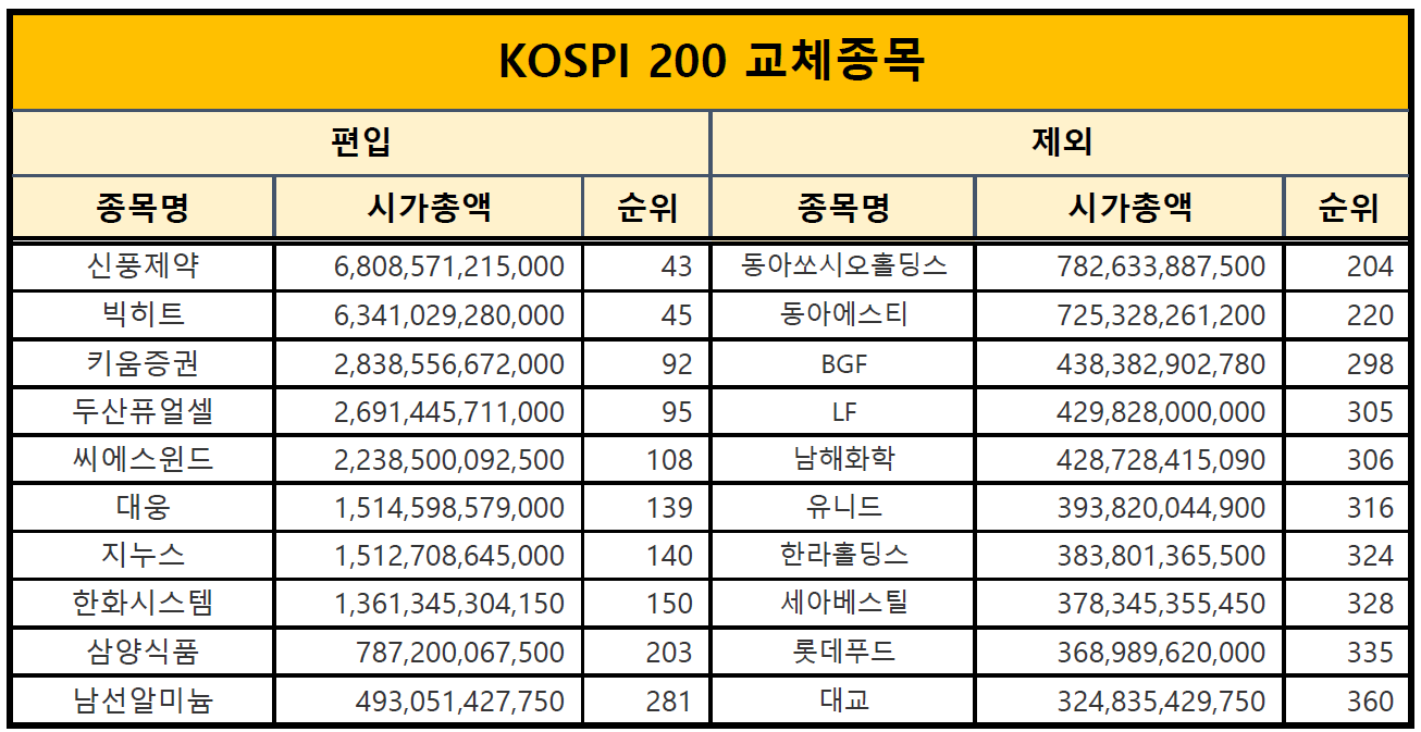 이번 정기변경에서 코스피 200 지수에는 10개 종목이 교체되었습니다.