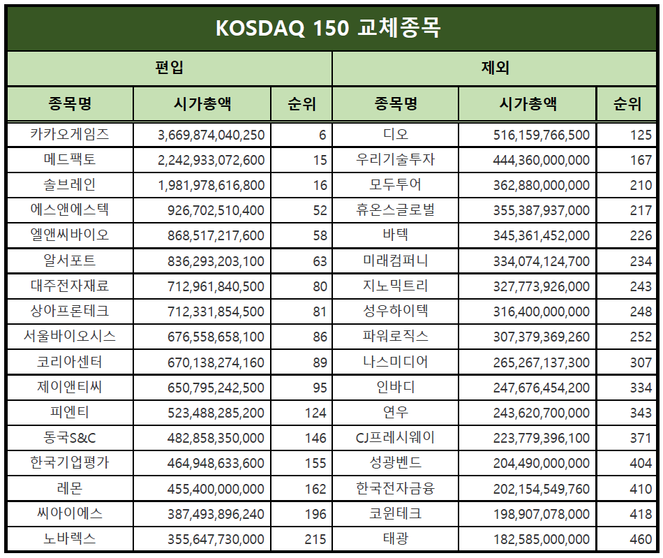 오늘 포스팅에서는 코스닥 150 지수는 무엇인지, 편입 조건, 심사 기준 등에 대해 알아보도록 하겠습니다. 참고로 이번 정기 변경에서 코스닥 150 지수에는 17개 종목이 교체되었습니다.