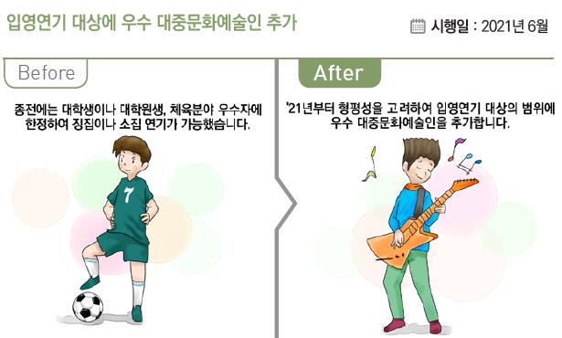 이에 세계무대에서 활약하여 국가 위상을 높이는 데 기여한 우수한 대중문화예술인들의 활동을 보장하고자 입영연기 대상에 이들을 포함하도록 「병역법」을 개정하였습니다.