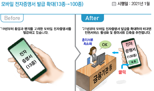 스마트폰을 이용하여 증명서 신청·발급·제출이 가능한 모바일 전자증명서가 주민등록등초본 등 13종에서 2021년 1월부터는 소득금액증명·장애인증명서 등 100종으로 대폭 확대됩니다.