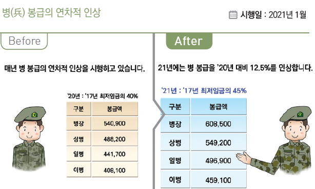 앞으로도 병역의무 이행자에 대한 합리적 보상 및 국가 책임 강화 차원에서 점진적으로 인상할 계획이라고 합니다.
