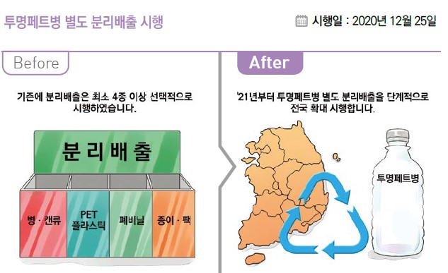 「재활용 가능자원의 분리수거 등에 관한 지침」 개정(’20.8)에 따라 투명 페트병 별도 배출이 ’20.12.25부터 단계적(先공동주택 → 後단독주택)으로 전국에 확대되었습니다.