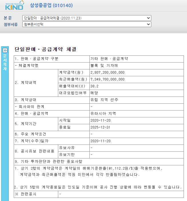 삼성중공업은 유럽 지역 선주와 총 25억 달러(2조 872억 원) 규모의 선박 블록·기자재 공급계약을 체결했다고 23일 오전 공시했습니다. 이는 삼성중공업 최근 매출액(73조 원)의 38%에 해당하는 큰 규모의 계약이라고 볼 수 있으며, 계약기간은 2025년 12월까지입니다. 이번 계약은 삼성중공업이 창사 후 체결한 단일 선박 계약으로는 최대 규모의 계약이라고 합니다.